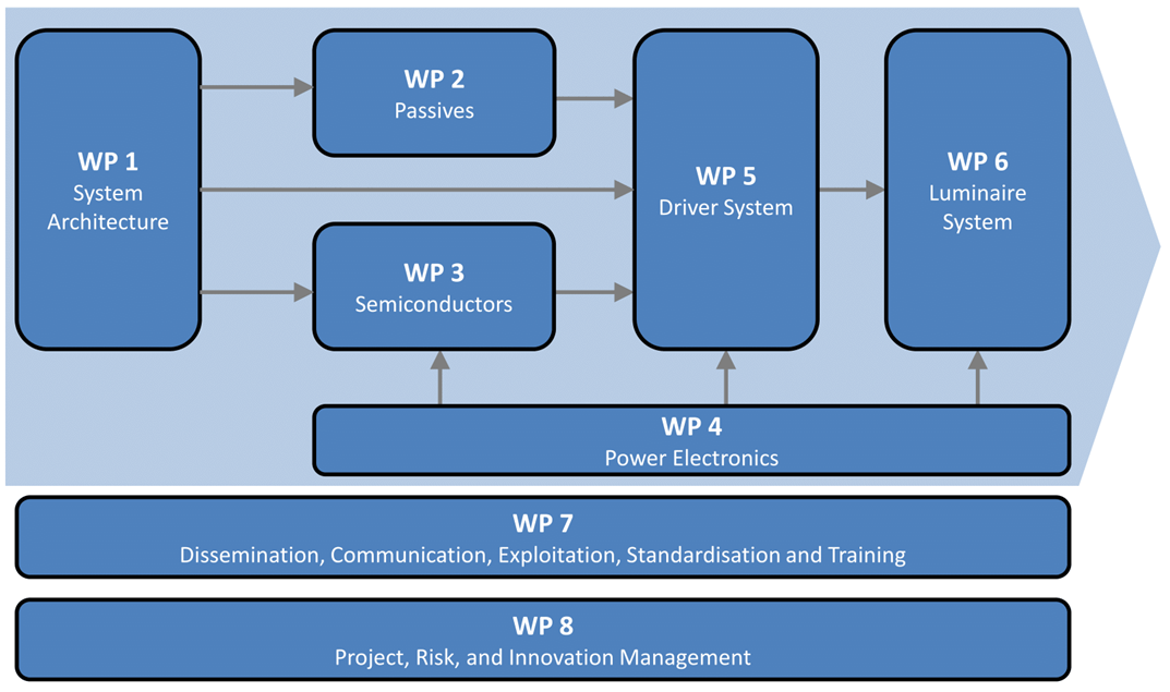 The LEDLUM project is planned to run for 36 months. It is organized into eight work packages (WP) with significant dependencies and expected synergies between them which are described shortly in the following.